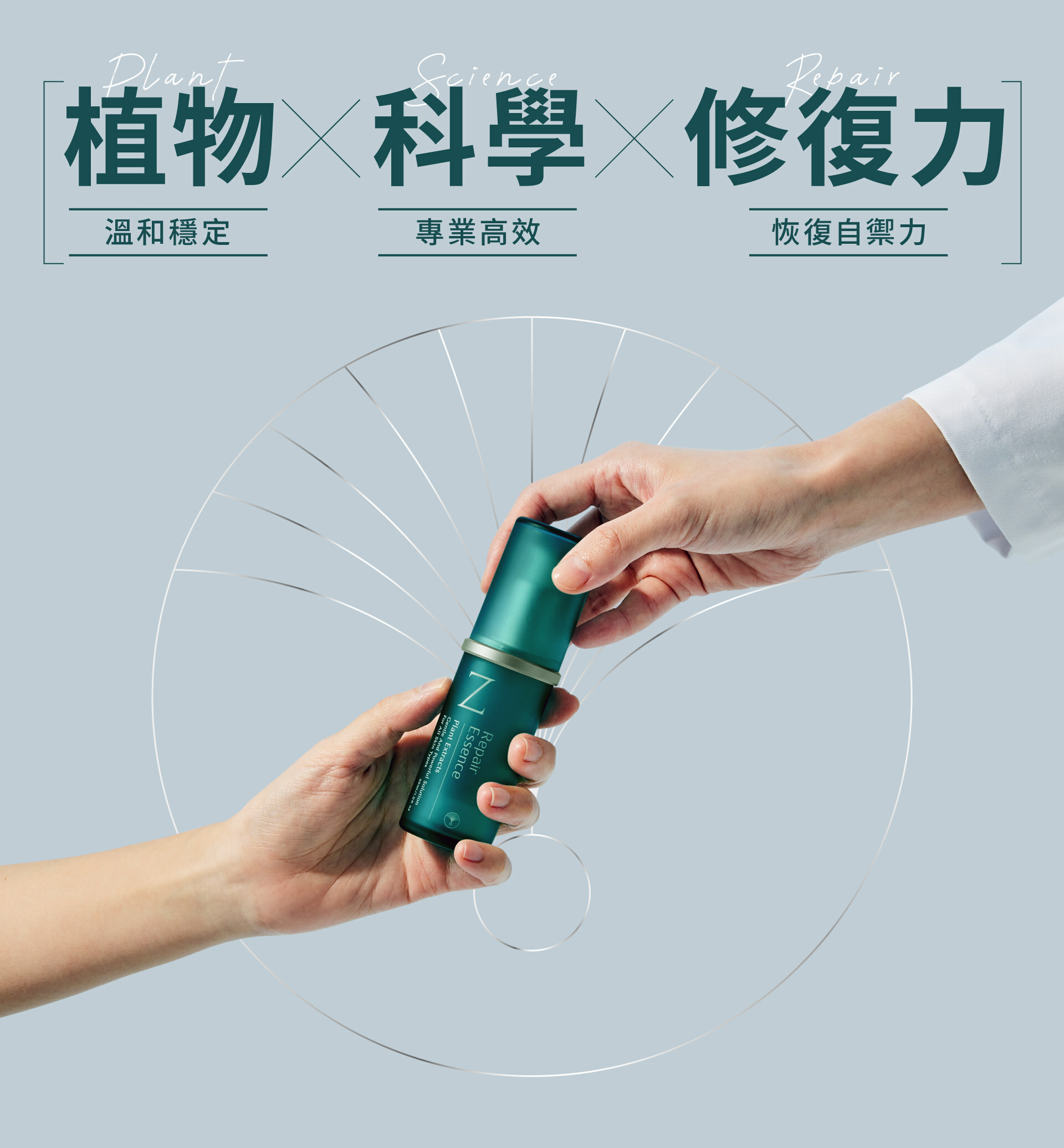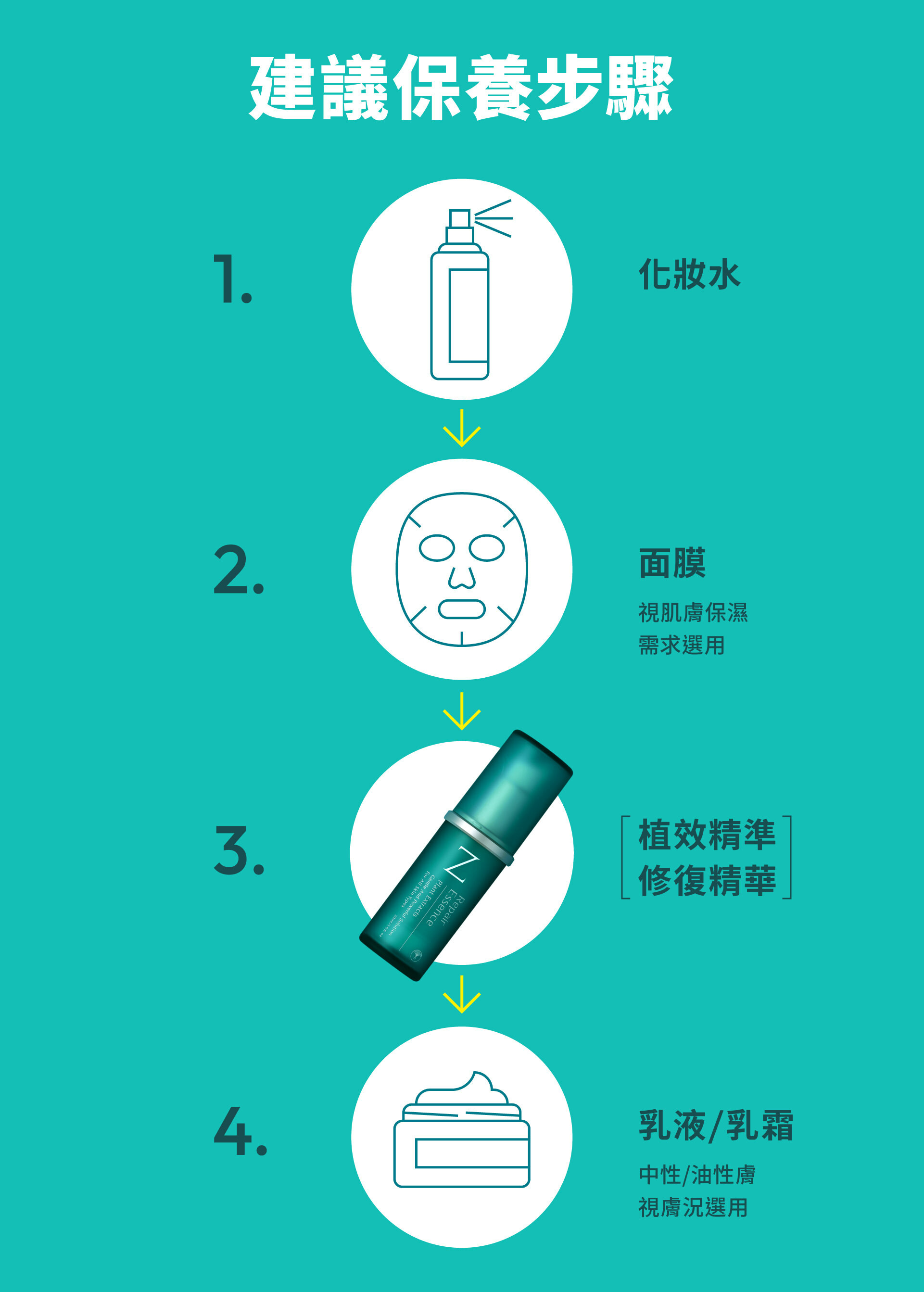 中性肌、油性肌膚:化妝水>植效精準修復精華>視肌膚狀態添加乳液