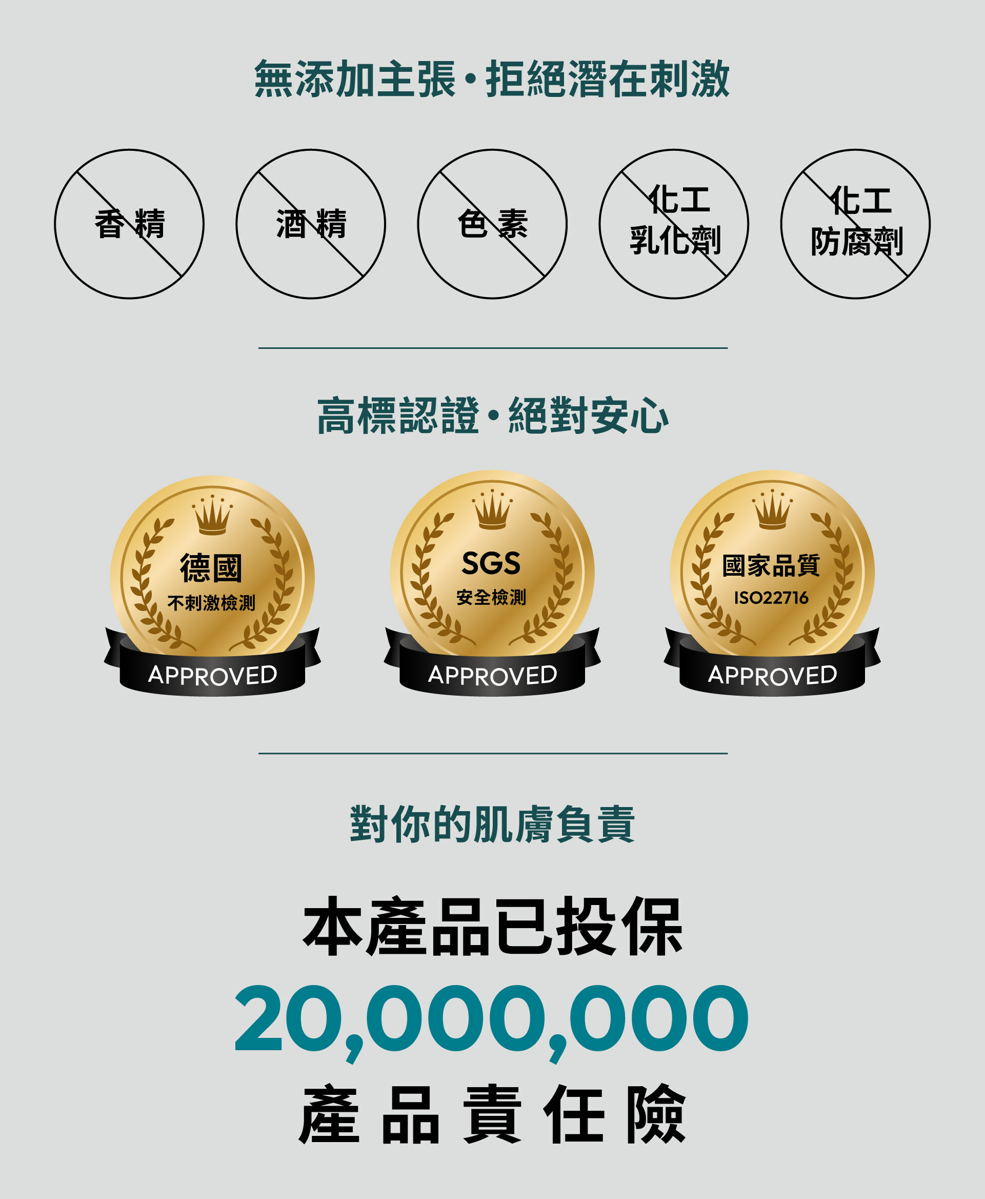 本產品已通過德國敏感性測試、SGS檢驗認證,及投保產品2,000萬責任險*